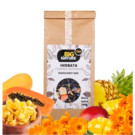 Opis: Opakowanie zawiera 100g czarnej herbaty superior "Owocowy Sad".