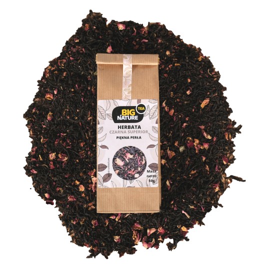 Herbata Piękna Perła to oryginalne połączenie czarnej herbaty z kwiatem róży. Idealna na wspólne wieczory z bliskimi. Czarna herbata miała swój początek już na początku V wieku, poddawana jest najdłuższemu procesowi utleniania ze wszystkich rodzajów herbat, dzięki czemu ma taki ciemny kolor. Herbata rośnie obecnie w 52 krajach – najstarsze drzewo w Chinach ma 3200 lata.