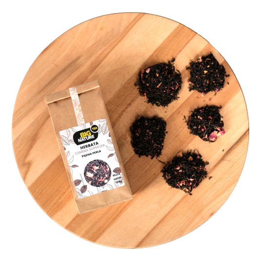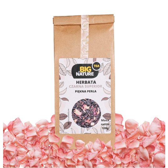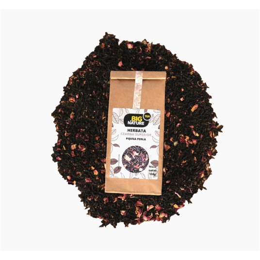 Herbata Piękna Perła to oryginalne połączenie czarnej herbaty z kwiatem róży. Idealna na wspólne wieczory z bliskimi. Czarna herbata miała swój początek już na początku V wieku, poddawana jest najdłuższemu procesowi utleniania ze wszystkich rodzajów herbat, dzięki czemu ma taki ciemny kolor. Herbata rośnie obecnie w 52 krajach – najstarsze drzewo w Chinach ma 3200 lata.