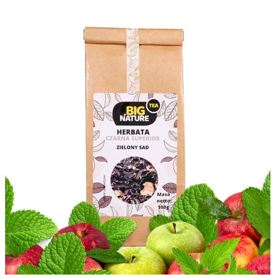Opis: Opakowanie zawiera 100g czarnej herbaty superior "Zielony Sad".