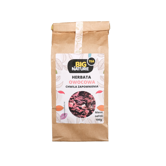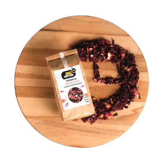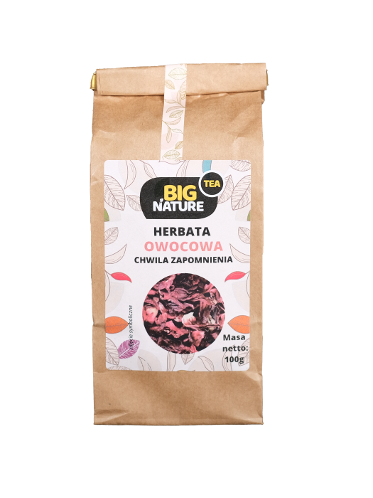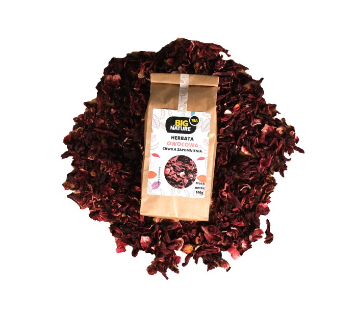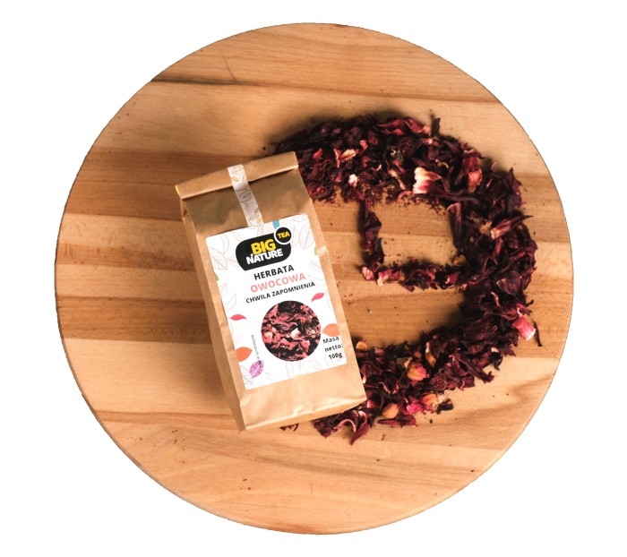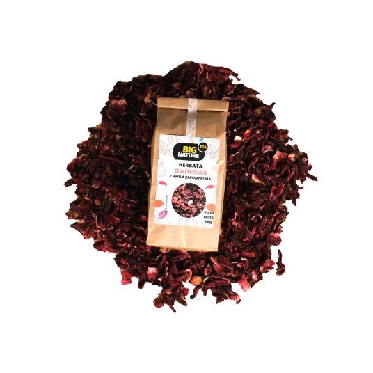 Składniki: hibiskus, truskawka liofilizowana, aromat, róża pąk.