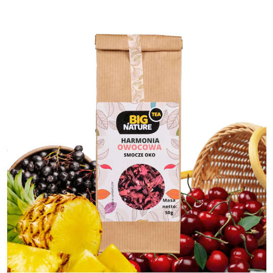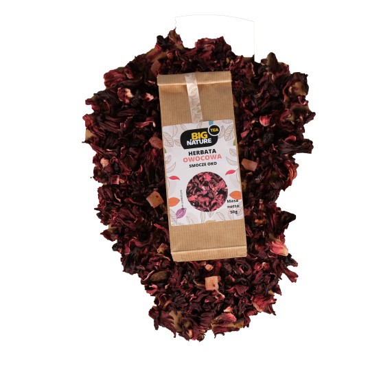 Herbata owocowa Smocze Oko to mieszanka na bazie hibiskusa o charakterystycznym aromacie. Dodatek wiśni, aronii, ananasa oraz rodzynek stanowi niepowtarzalną kompozycję smakową. Idealna na ciepłe letnie wieczory. Idealnie sprawdzi się na wieczorny relaks. Herbaty owocowe są najbardziej różnorodnymi herbatami. Jest to spowodane szeroką możliwością wyboru owoców do jej stworzenia. Głównym składnikiem herbaty owocowej jest hibiskus. W Egipcie herbata z hibiskusa jest traktowana jako napój narodowy i to nią wita się gości.