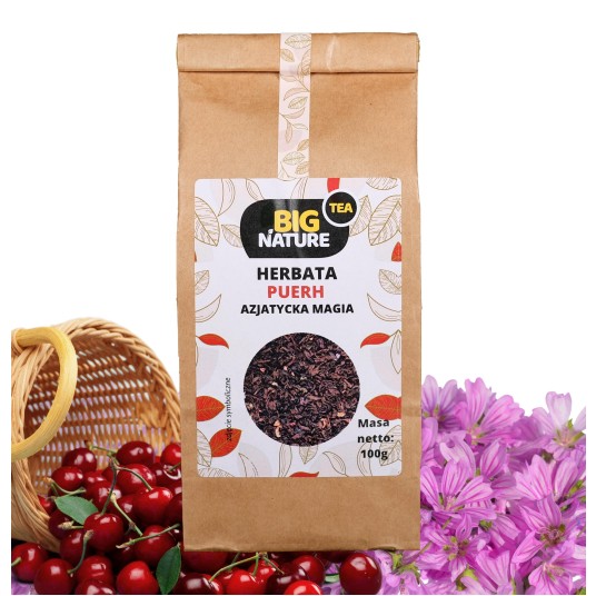 Składniki: herbata puerh, wiśnia, ślaz kwiat, róża płatek, aromat.