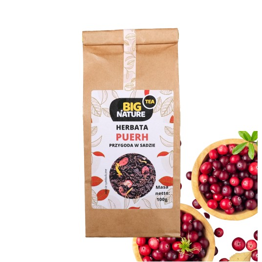 Herbata PUERH Przygoda w Sadzie to chińska czerwona herbata z dodatkiem żurawiny, kwiatu słonecznika oraz ślazu. Takie połączenie, nadaje naparowi wyjątkowego smaku i aromatu. W przeciwieństwie do herbaty czarnej jest poddawana procesowi fermentacji. Cechuje ją aromatyczny, gorzki smak i wyraźny, ziemno-korzenny aromat.
