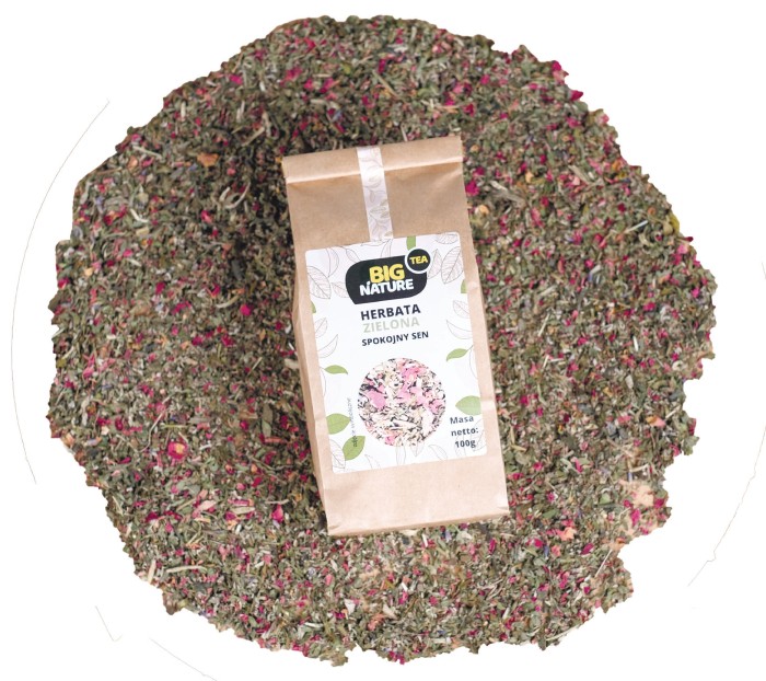 Opis: Opakowanie zawiera 100g zielonej herbaty "Spokojny Sen".