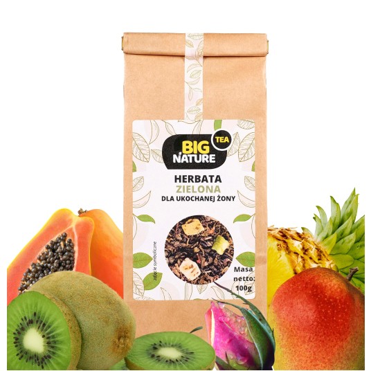 Składniki: herbata zielona, aromat, papaja, ananas, mango, kiwi, róża pąk.