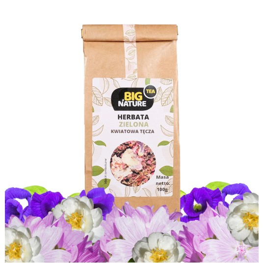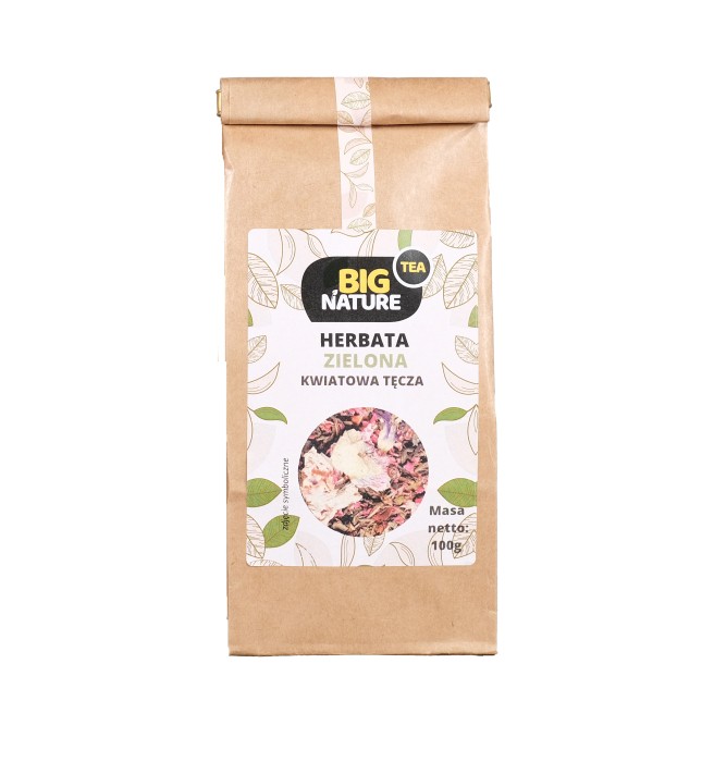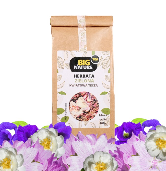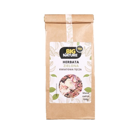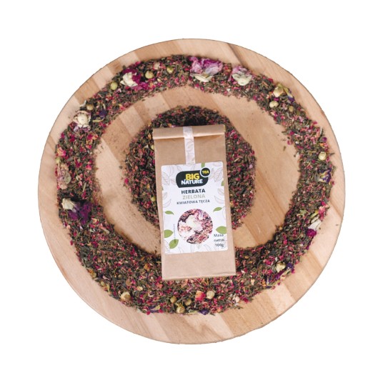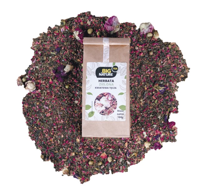 Opis: Opakowanie zawiera 100g zielonej herbaty "Kwiatowa Tęcza".
