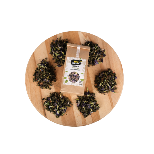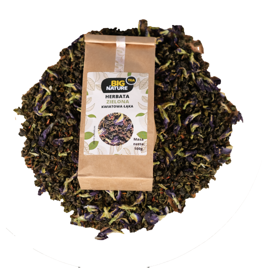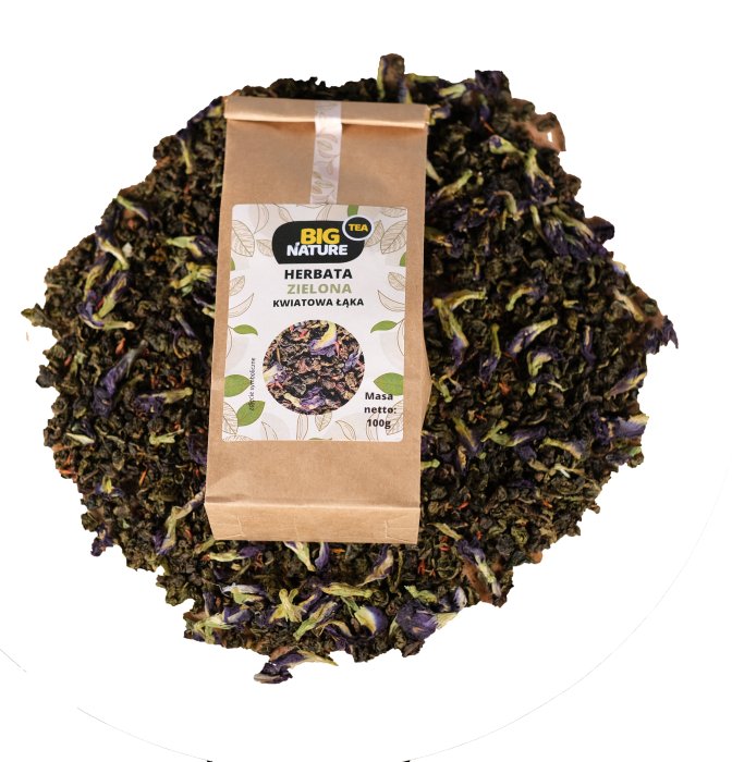 Herbata zielona Oolong Kwiatowa Łąka to kompozycja szlachetnej zielonej herbaty, pięknego niebieskiego kwiatu klitorii oraz szafranu. Idealny smak i aromat. Historia zielonej herbaty rozpoczyna się w XXVIII wieku p.n.e.. Jeden z cesarzy chińskich odpoczywając pod krzewem herbacianym, zauważył, iż kilka listków rośliny wpadło mu do miseczki z gorącą wodą. Gdy spróbował aromatycznego naparu, poczuł się nim zafascynowany. Zielona herbata jest zdrowsza od herbaty czarnej, a zarazem mniej popularna. W światowej produkcji zielonej herbaty dominują Chiny, kolejne są Japonia, Indonezja i Wietnam. Niesłodzona zielona herbata jest napojem o zerowej kaloryczności. Herbata zielona oolong jest herbatą półfermentowaną. Jej liście suszone są na patelniach.