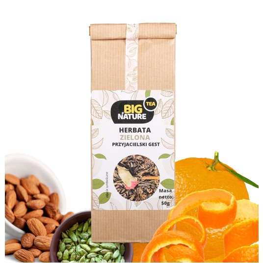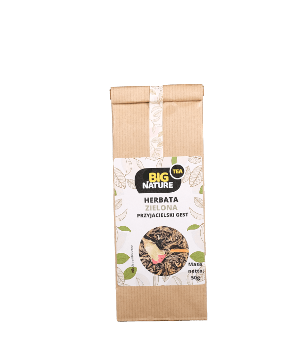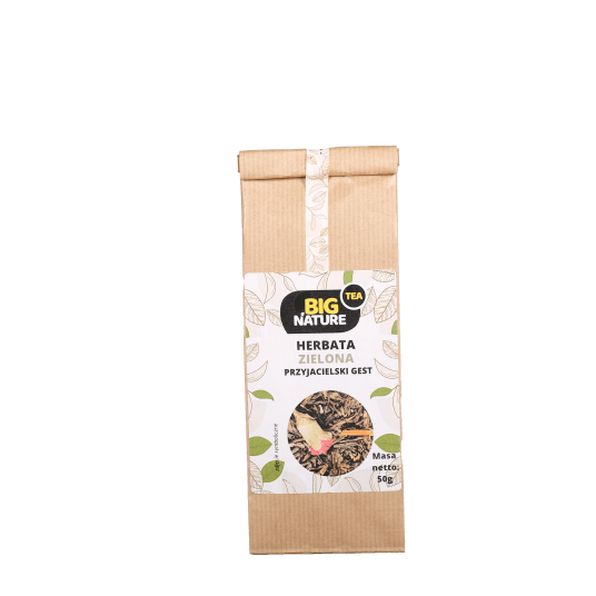 Opis: Opakowanie zawiera 50g zielonej herbaty "Przyjacielski Gest".