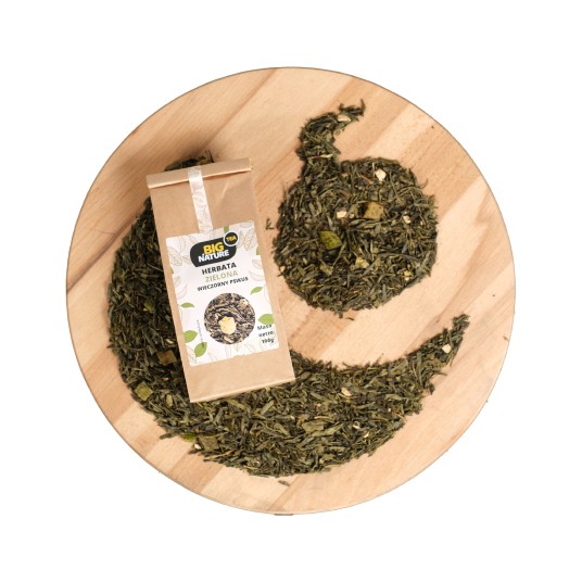 Herbata zielona Wieczorny Psikus to znakomita propozycja na letnie wieczory. Połączenie orzeźwiającego eukaliptusa i rozgrzewającego imbiru, stworzy nadzwyczajny smak. Historia zielonej herbaty rozpoczyna się w XXVIII wieku p.n.e.. Jeden z cesarzy chińskich odpoczywając pod krzewem herbacianym, zauważył, iż kilka listków rośliny wpadło mu do miseczki z gorącą wodą. Gdy spróbował aromatycznego naparu, poczuł się nim zafascynowany. Zielona herbata jest zdrowsza od herbaty czarnej, a zarazem mniej popularna. W światowej produkcji zielonej herbaty dominują Chiny, kolejne są Japonia, Indonezja i Wietnam. Niesłodzona zielona herbata jest napojem o zerowej kaloryczności.