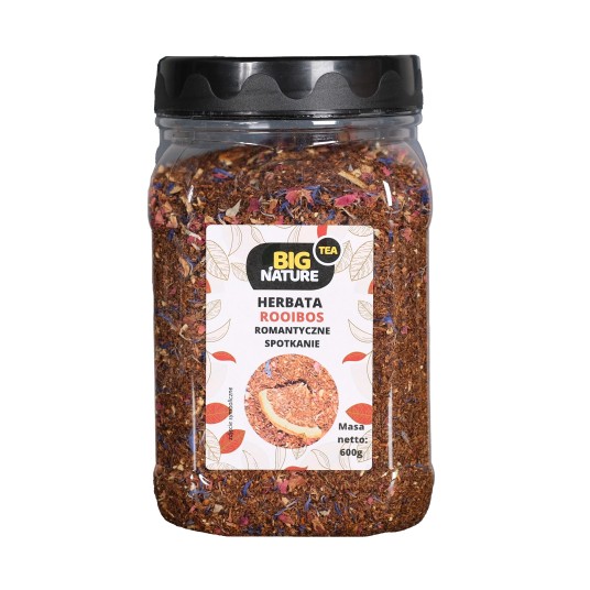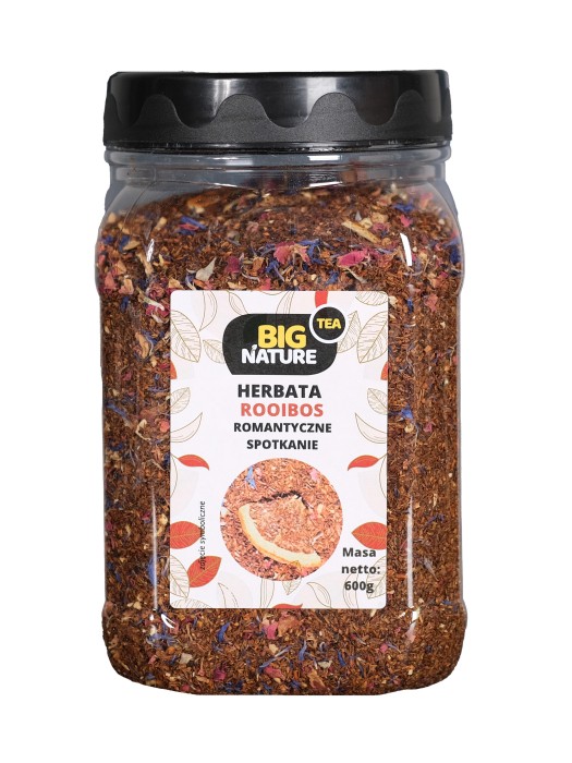 Opis: Opakowanie zawiera 600g herbaty "Rooibos Romantyczne Spotkanie".