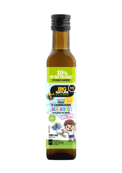 Opis: Opakowanie zawiera 250ml oleju dla dzieci z czarnuszki tłoczonego na zimno. Suplement Diety.