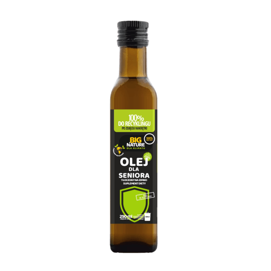 Opis: Opakowanie zawiera 250ml oleju dla seniora tłoczonego na zimno.