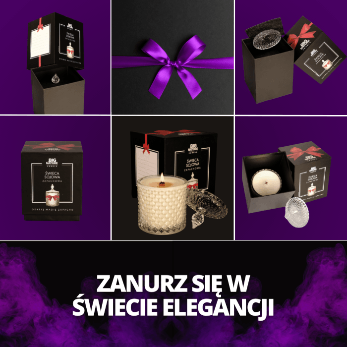 Zanurz się w świecie naszych świec sojowych prezentowych, gdzie elegancja i doskonałość spotykają się z niezapomnianym zapachem. Nasze wyjątkowe kompozycje zapachowe są owocem pasji, a każda świeca to dzieło sztuki, które czuje się każdym zmysłem