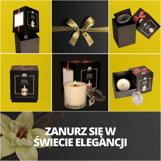 Zanurz się w świecie naszych świec sojowych prezentowych, gdzie elegancja i doskonałość spotykają się z niezapomnianym zapachem. Nasze wyjątkowe kompozycje zapachowe są owocem pasji, a każda świeca to dzieło sztuki, które czuje się każdym zmysłem