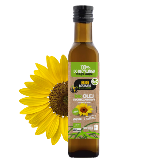 Opis: opakowanie zawiera 250ml bio oleju słonecznikowego tłoczonego na zimno.