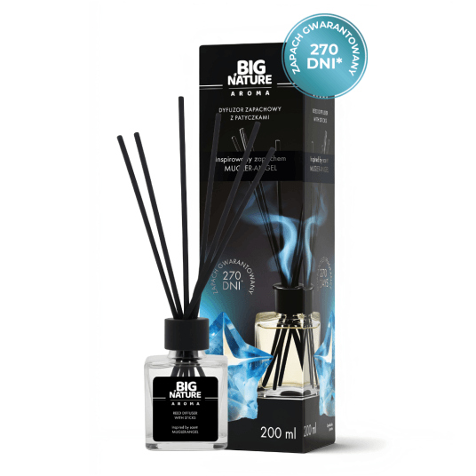 Poznaj nasz ekskluzywny Dyfuzor Zapachowy o pojemności 200ml z patyczkami, inspirowany kultowym zapachem MUGLER ANGEL. Zapakowany w elegancki, czarny kartonik, ten dyfuzor odświeża powietrze i dodaje wnętrzu wyjątkowej głębi. Jego intensywny, drzewno-bursztynowy aromat tworzy atmosferę tajemniczości i zmysłowości, idealną do każdego stylowego wnętrza.