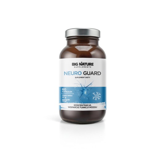 Neuro Guard to zaawansowany suplement diety opracowany z myślą o osobach pragnących zwiększyć koncentrację, poprawić pamięć i usprawnić funkcje poznawcze. Zawiera starannie dobrane ekstrakty roślinne, które od wieków wykorzystywane są w celu wspierania pracy mózgu – soplówkę jeżowatą, żeń-szeń syberyjski, wąkrotkę azjatycką (gotu kola) oraz bakopę drobnolistną. Dzięki synergicznemu działaniu składników Neuro Guard wspiera aktywność umysłową, pomaga lepiej radzić sobie z codziennym stresem i przeciążeniem psychicznym, a także wspomaga długotrwałą koncentrację i procesy zapamiętywania.