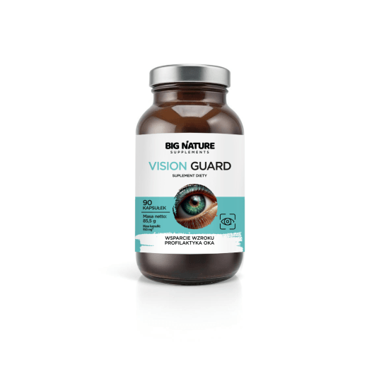 VISION GUARD to starannie opracowany suplement diety, którego celem jest wspieranie prawidłowego widzenia oraz ochrona oczu przed negatywnym wpływem światła niebieskiego, zmęczenia i stresu oksydacyjnego. Formuła zawiera naturalne ekstrakty roślinne (borówka czarna, rokitnik), przeciwutleniacze (astaksantyna, witamina E), a także kluczowe dla wzroku substancje jak luteina, zeaksantyna, cynk i witamina A. Dzięki synergii działania składników aktywnych VISION GUARD pomaga zachować ostrość widzenia, wspiera funkcjonowanie siatkówki oka i chroni komórki przed stresem oksydacyjnym wywołanym przez ekspozycję na światło ekranów, promieniowanie UV czy długotrwałą pracę przy komputerze.