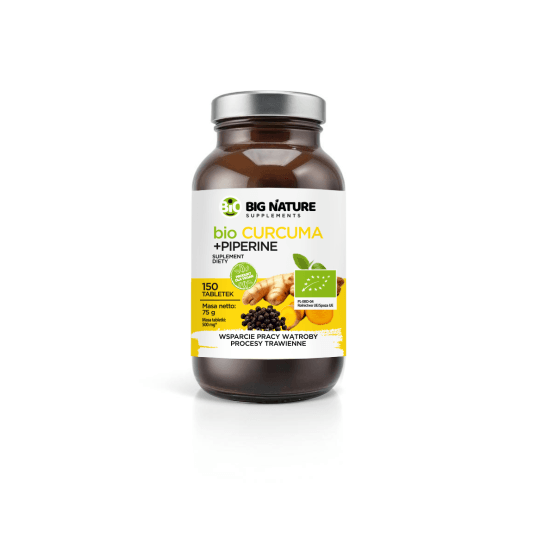 BIO Curcuma + Piperine to wysokiej jakości suplement diety, stworzony z myślą o naturalnym wsparciu pracy wątroby i układu trawiennego. Zawarta w nim kurkuma (Curcuma longa) od wieków ceniona jest za swoje właściwości prozdrowotne – wspiera funkcjonowanie wątroby, procesy trawienne oraz odporność organizmu. Dodatek piperyny – aktywnego ekstraktu z czarnego pieprzu – zwiększa przyswajalność kurkuminy, głównego składnika aktywnego kurkumy, co znacząco potęguje jej działanie. Regularne stosowanie pomaga zadbać o zdrowie przewodu pokarmowego i ogólne samopoczucie, a wszystko to w wygodnej, roślinnej formie.