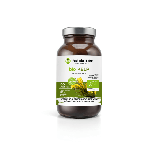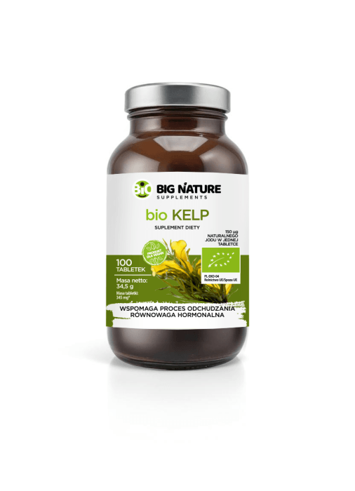 BIO Kelp to suplement diety oparty na naturalnym morskim źródle jodu – brunatnicy Ascophyllum nodosum. Jod odgrywa kluczową rolę w prawidłowym funkcjonowaniu tarczycy, odpowiadając za produkcję hormonów regulujących metabolizm, poziom energii i równowagę hormonalną. Regularne stosowanie kelpu wspiera pracę tarczycy, może pomóc w kontroli masy ciała i detoksykacji organizmu. Kelp jest także bogaty w witaminy i minerały, co czyni go doskonałym uzupełnieniem codziennej diety.