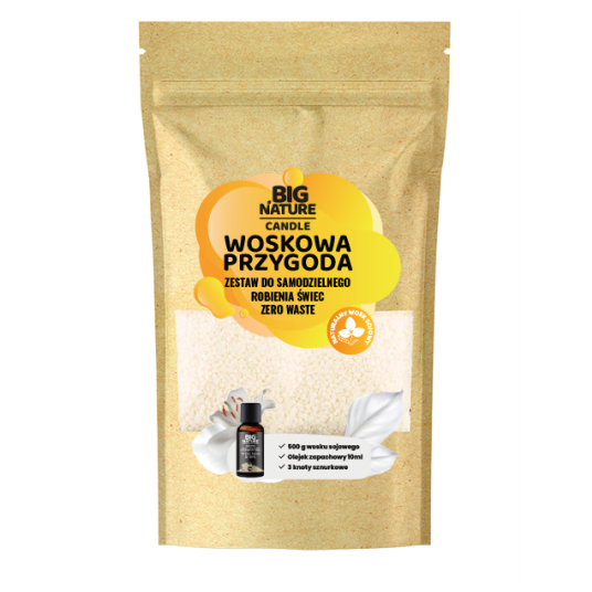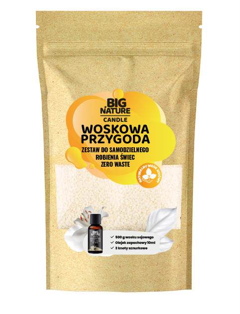 „Woskowa Przygoda” to kompletny zestaw DIY, który zawiera 500 g wosku sojowego, 3 knoty sznurkowe oraz aromatyczny olejek Wellness&SPA. Idealny do świec w szkle, ceramice i formach. Możesz dowolnie uzupełniać i personalizować swoje kompozycje zapachowe. Kreatywna zabawa, piękna dekoracja i wyjątkowy prezent — wszystko w jednym zestawie!