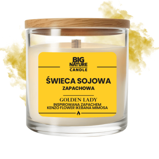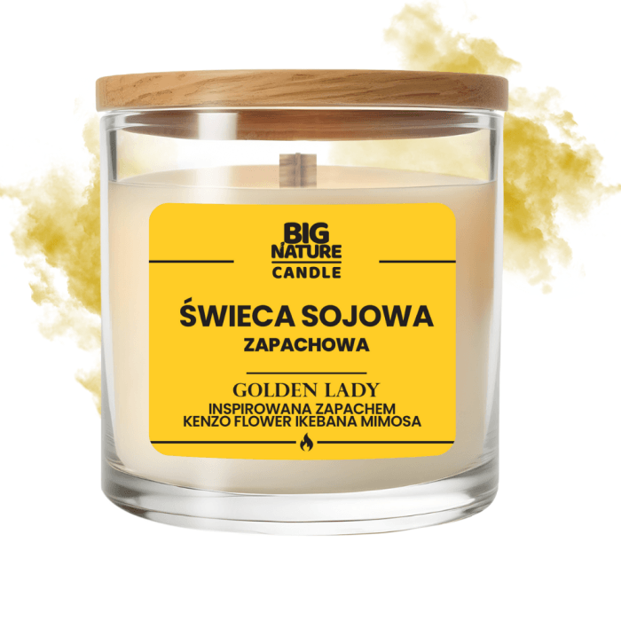 Świeca sojowa Golden Lady to elegancka i kwiatowa kompozycja inspirowana zapachem Kenzo Flower Ikebana Mimosa. Połączenie słodyczy mimosy z delikatnymi nutami jaśminu, bergamotki i ciepłego piżma wprowadza do wnętrza harmonię, radość i słoneczną lekkość. Idealna, by dodać przestrzeni świeżości i pozytywnej energii.