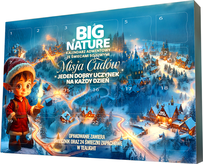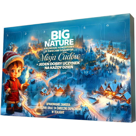 Przeżyj grudzień pełen małych cudów! Kalendarz adwentowy „Misja Cudów” łączy sojowe świeczki z prostymi codziennymi gestami życzliwości. Każde okienko to nowe zadanie - uśmiech, pomoc, ciepłe słowo - które rozjaśni Twój dzień i serca innych. Podaruj sobie lub bliskim chwilę uważności, radości i prawdziwego świątecznego ciepła.