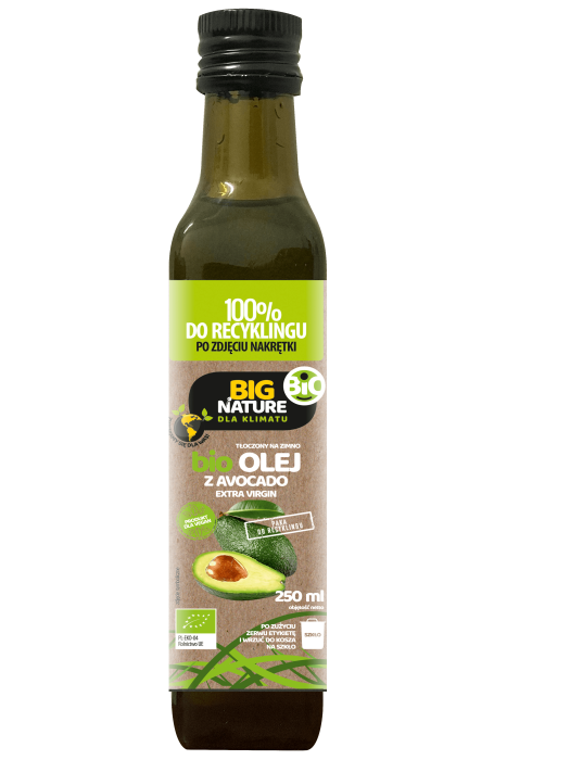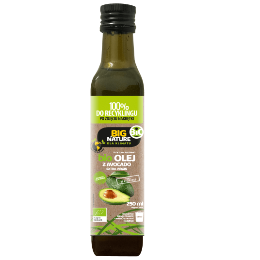 Opis: Opakowanie zawiera 250ml bio oleju z awokado extra virgin tłoczonego na zimno.
