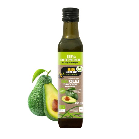 Ekologiczny olej z awokado extra virgin otrzymywany przez tłoczenie na zimno i filtrację. Tłoczony na zimno organiczny olej z awokado posiada zielonkawy kolor, lekki orzechowy smak i zapach świeżego miąższu owocowego. Ze względu na swój wspaniały kolor i właściwości jest powszechnie używany jako cenny dodatek do sałatek i wielu innych potraw. Przyjmuje się, że nawet jedna trzecia uprawianych owoców awokado jest wykorzystywana do wyrobu oleju.
