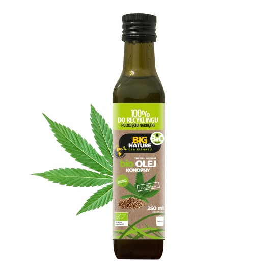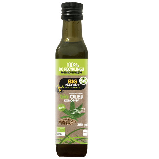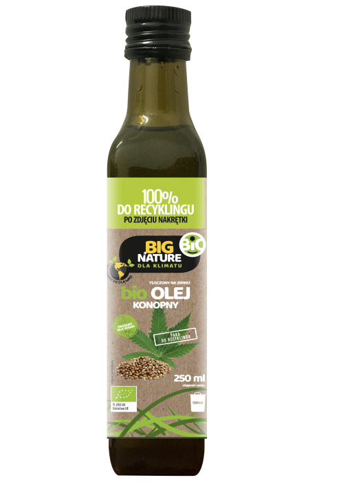 Ekologiczny olej konopny pozyskiwany jest z nasion konopi (Cannabis sativa). Olej otrzymywany jest poprzez tłoczenie mechaniczne bez zastosowania ciepła (tłoczenie na zimno) Największym atutem oleju konopnego jest jego silne działanie wspomagające naturalną odporność organizmu. Reguluje gospodarkę lipidową organizmu, oraz wspomaga usuwanie toksyn z organizmu. Zawiera naturalnie występujący w nasionach chlorofil, który działa przeciwzapalnie i łagodząco.