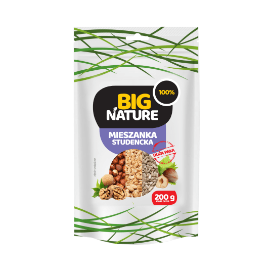 Składniki: orzechy arachidowe niesolone, rodzynki, nerkowiec, orzechy laskowe, słonecznik łuskany, orzechy włoskie.