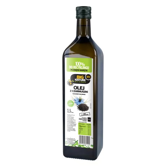Opis: Opakowanie zawiera 1L oleju z czarnuszki tłoczonego na zimno.