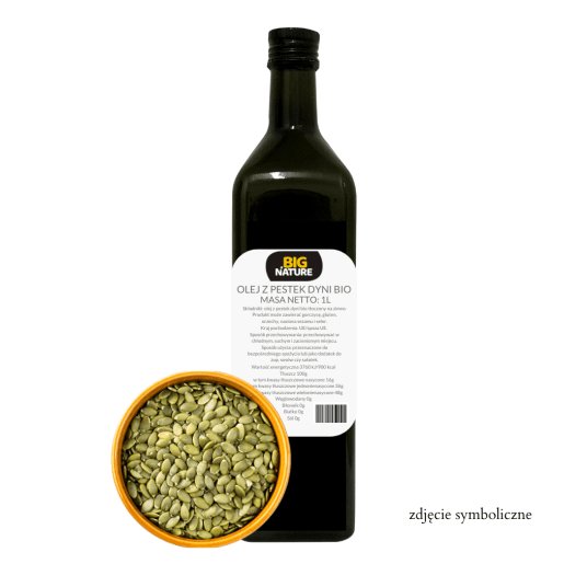 Ekologiczny olej z pestek dyni pozyskiwany jest z pestek dyni (Cucurbita maxima). Olej otrzymywany jest poprzez tłoczenie mechaniczne bez zastosowania ciepła (tłoczenie na zimno). Bio Olej z pestek dyni zasługuje na uwagę ze względu na różnorodność występujących w nim składników i wartości odżywczych, które wykazują szereg korzystnych efektów dla zdrowia człowieka.