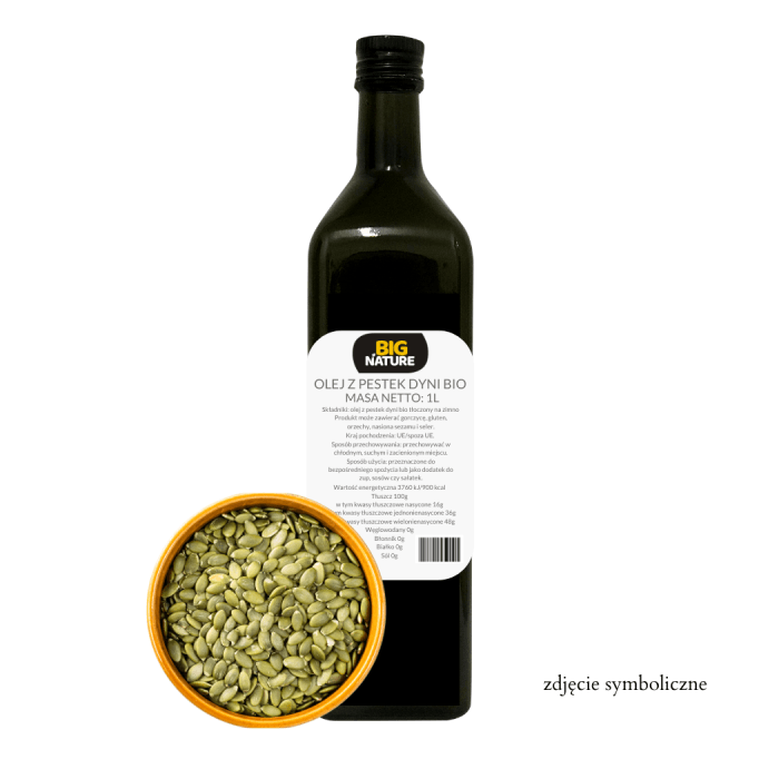 Opis: Opakowanie zawiera 1l bio oleju z pestek dyni.