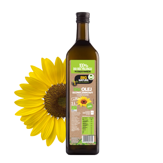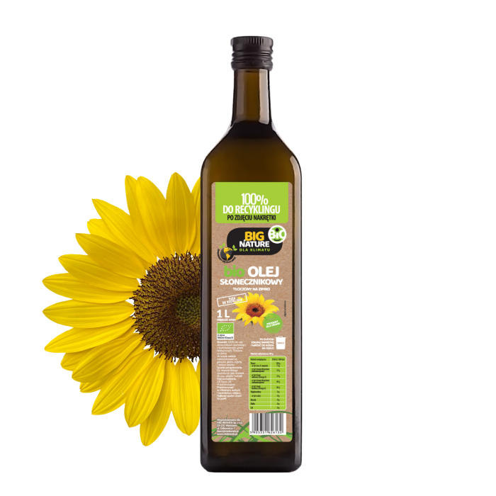 Opis: opakowanie zawiera 1L bio oleju słonecznikowego tłoczonego na zimno.